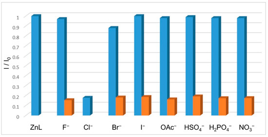 Plot of the ratio between the fluorescence emission intensity of [ZnL]2+ complex at 374 nm (λex = 277 nm) (I) and the emission intensity in the presence of 1 equiv. of F−, Cl−, Br−, I−, OAc−, HSO4−, H2PO4−, and NO3− anion (I0, blue bars), or in the co-presence of 1 equiv. of Cl− and 2 equiv. of F−, Br−, I−, OAc−, HSO4−, H2PO4−, and NO3− anions (as tetrabutylammonium salts, orange bars).