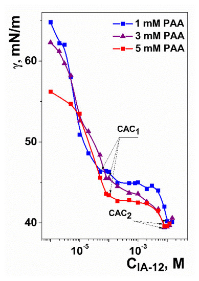 The first stage of the investigation was dedicated to the study of the aggregation properties of polymer–colloid systems. For this purpose, the surface tension technique was successfully used (Figure 2). Inflection points in surface-tension isotherms are usually taken as the critical micelle concentration (CMC) or the critical association concentration (CAC). Usually, there are more inflection points in the case of surfactant/polyelectrolyte systems in comparison with individual amphiphile solutions. This depends on various factors, including the nature and concentration of components, molecular weight of the polymer, geometry of the molecules, solution pH, polyelectrolyte ionization degree, ionic strength, etc. It was shown that two inflection points were observed for the IA-12/PAA binary systems (Figure 2) regardless of the PAA concentration. The first inflection point (CAC1, see arrows in Figure 2) reflects the IA-12 concentration, at which the formation of amphiphile/polyelectrolyte complexes begins. The second inflection point (CAC2, see arrows in Figure 2) corresponds to the saturation of macromolecules by amphiphile aggregates, after which individual IA-12 aggregates are formed. The CAC1 and CAC2 values obtained are compared with the CMC value for the individual IA-12 solutions [43] (Table 1). The addition of polyelectrolyte results in the formation of aggregates at a ca. 200 times lower amphiphile concentration (0.046 mM) than in the case of individual amphiphile solutions (9 mM). This effect is mostly expressed in the case of the lowest PAA concentration (1 mM) and diminishes with an increase in the PAA concentration (Table 1). This fact is probably due to the distribution of amphiphiles between different macromolecules with an increase in their amount in solution.
