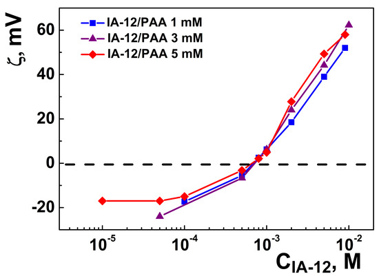 Zeta potential versus IA-12 concentration plot for the IA-12/PAA binary systems; 25 °C.