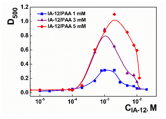 In all cases, an increase in the IA-12 concentration results in the enhancement of the opalescence in the system followed by its disappearance, with a further increase in the micelle concentration (Figure 5). It is noteworthy that the turbidimetric data are in good accordance with the above variation in zeta potential in the systems. The highest absorbance was detected in the area of the isoelectric points of the systems, while the solutions were more transparent in the region of the existence of positive or negative zeta potential. This phenomenon could be caused by the fact that uncharged colloid species tend to aggregate, thereby inducing inhomogeneity. On the contrary, charged particles are more stable due to electrostatic repulsion preventing their aggregation and sedimentation. As can be seen, the maximum of absorbance shifts to the right with an increase in the PAA concentration, thereby indicating that the charge behavior of the binary systems is influenced by the polyelectrolyte concentration, although this is unobvious from the zeta potential data in Figure 4.