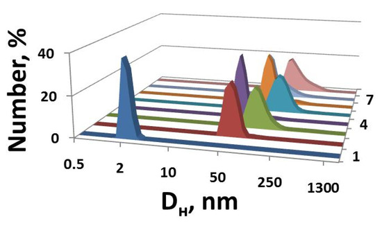 Measurements of size and charge characteristics of samples were carried out using dynamic and electrophoretic light scattering techniques at Malvern ZetaSizer Nano ZS apparatus (Malvern Instruments Ltd., Malvern, UK). A source of irradiation was a He-Ne gas laser with 4 MW power (λoperating = 633 nm). Collected signals were treated in terms of frequency and phase analysis of scattered light using software attached to the device. All measurements were carried out at a 173° scattering angle. Computation of particle size was performed in accordance with the Stokes–Einstein equation [54]:
