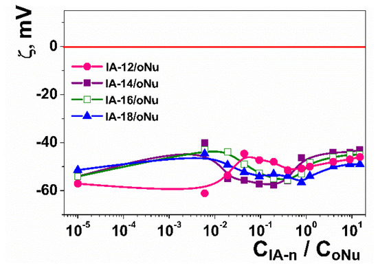 Electrokinetic potential versus amphiphile/oNu molar ratio for the IA-12/oNu, IA-14/oNu [45], IA-16/oNu [45] and IA-18/oNu [45] binary systems; 25 °C.