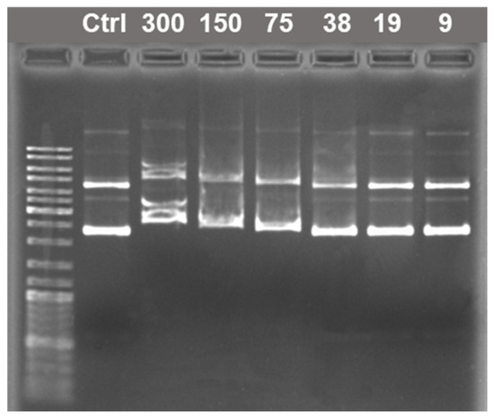 Electrophoretic mobility of pDNA in a complex with IA-12. Ctrl shows pure pDNA. N/P ratios are indicated above the corresponding wells. A DNA ladder from 100 to 10,000 bp was used.