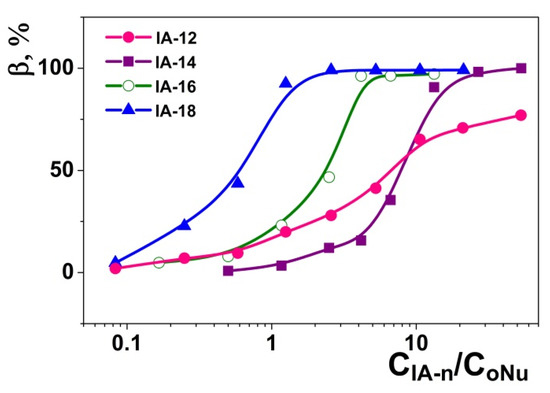 Binding degree of IA-12 with oNu versus IA-n concentration plot for the IA-12/oNu, IA-14/oNu [45], IA-16/oNu [45] and IA-18/oNu [45] mixtures; 25 °C.