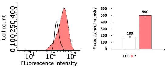 Cellular uptake study of the IA-12/oNu complex. 1—Intact M-HeLa cells; 2—M-HeLa cells in the presence of the IA-12/oNu complex.