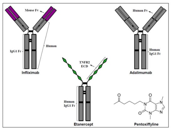 TNF-α Antagonists. Clinically used selective TNF-α antagonists include recombinant TNF-α-specific monoclonal antibodies such as infliximab and adalimumab, and recombinant fusion proteins of TNFR such as etanercept which is a TNFR2 fusion protein. Pentoxifylline is a methylxanthine drug which exerts several pharmacological effects including potent inhibition of TNF-α activity (i.e., it is not a selective TNF-α antagonist). Abbreviations: ECD—extracellular domain, Fc—fragment crystallizable region, Fv—variable fragment, IgG—immunoglobulin G, TNFR2 – TNF-α receptor 2.