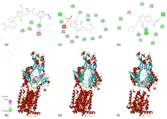 AcrB subunit of the multidrug efflux pump chain B (PDB code: 5NC5). (i) Experimental data—(a) AA in close contact with puromycin (antibiotic crystallized with the protein); (b) puromycin allosteric binding situs. (ii) Predicted data—(c,e) AA in close contact with BG1189 respectively BG1190; (d,f)—BG1189 respectively BG1190 interacting with pore domains of AcrB subunit. (a,c,e) Light green: van der Waals interactions; green: conventional hydrogen bond, grey: carbon hydrogen bond; red: unfavorable acceptor–acceptor interaction; dark pink: Pi–Pi T-shaped interaction; light pink: Pi–Alkyl interactions; (b,d,f) alpha helices of the protein are represented in red color, beta sheets in blue, turns in green, and random coil in grey. Images were obtained using Discovery Studio Visualizer [36].