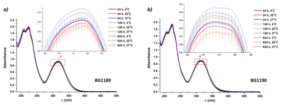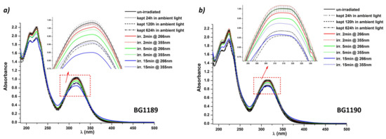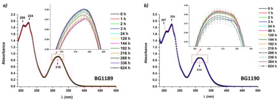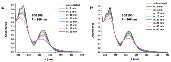 Figure 6 presents the absorption spectra of BG1189 and BG1190 irradiated for different periods (up to 60 min). The hypochromic effect observed during irradiation indicates a modification of the compounds. Moreover, a hypsochromic shift was observed from 318 nm to 307 nm for BG1189 (Figure 6a) and from 314 nm to 308 nm in the case of BG1190 (Figure 6b).