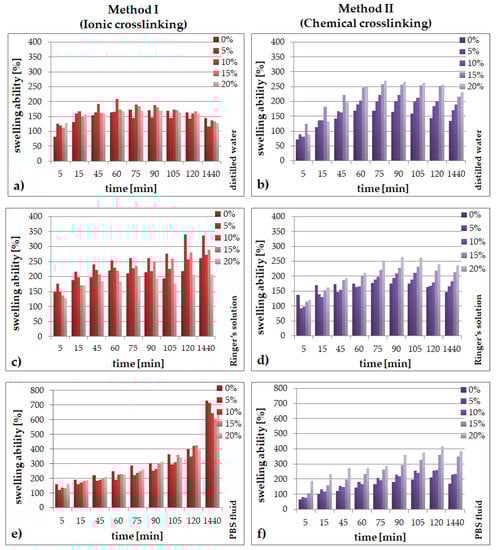 Swelling ability for SA/PVA/EP hydrogels obtained using method I (left side) or method II (right side) in: (a,b) distilled water; (c,d) Ringer’s solution; (e,f) in PBS fluid.