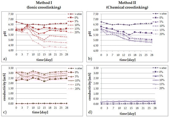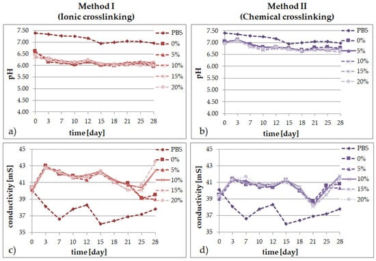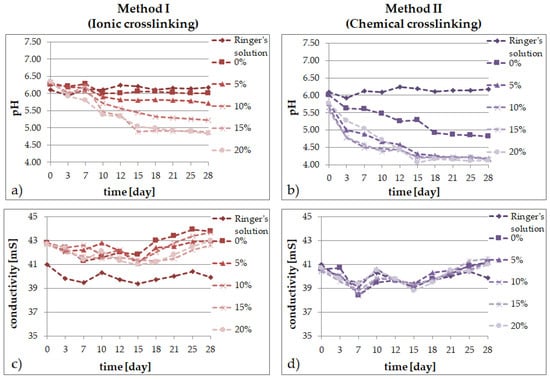 Changes of Ringer’s solution during 28 days for SA/PVA/EP hydrogels prepared using method I (left side) or method II (right side) in pH value (a,b) and conductivity (c,d).