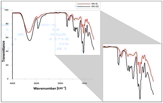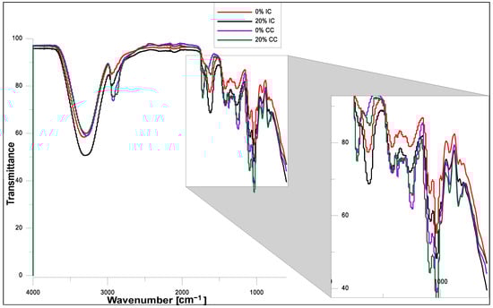 FT-IR spectra of SA/PVA hydrogels modified by Echinacea purpurea extract prepared using method I (ionic crosslinking, IC) or method II (chemical crosslinking, CC).