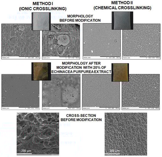 An analysis of SEM micrographs enabled the determination of the surface morphology of the hydrogel materials obtained using the ionic or chemical crosslinking as well as before and after a modification with the E. purpurea extract. Additionally, the cross-section of hydrogels was analyzed, which showed significant differences in the structure (Figure 7).