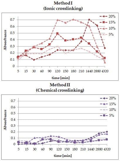 The differences in the release profiles of echinacoside from the hydrogels modified by various amounts of the Echinacea purpurea extract and obtained using method I—ionic—or method II—chemical—crosslinking are presented in Figure 8.