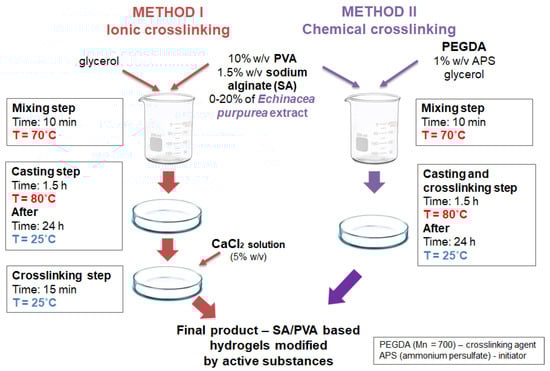 To obtain SA/PVA/EP hydrogels, a 10% (w/v) solution of poly(vinyl alcohol), 1.5% (w/v) solution of sodium alginate, E. purpurea extract, 1% (w/v) solution of ammonium persulfate, and 5% (w/v) solution of calcium chloride were prepared using water. Next, appropriate amounts of these solutions as well as a constant amount of glycerine (3.5%) (using method I—ionic crosslinking) were mixed. In the case of method II—chemical crosslinking—constant amounts of poly(ethylene glycol) diacrylate (7.75%) were added [,]. Detailed descriptions of the mixture compositions used for hydrogel preparation are shown in Table 1. Subsequently, the mixtures were heated to 70 °C and 4.4% (v/v) of ammonium persulfate were added. After that, all the specimens were poured into Petri dishes and placed on a heating plate at a temperature of 80 °C for 1.5 h. In this way, a series of hydrogels with different amounts of the E. purpurea extract (5, 10, 15, 20 and 25%, v/v) were prepared. Finally, the materials were placed for 24 h in ambient conditions. In the next step, in the case of method I, a 5% (w/v) solution of calcium chloride was added into each sample. The whole procedure is presented in Figure 9 and the compositions of the hydrogels in Table 1.