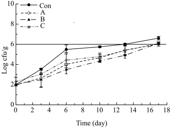 Evolution of Pseudomonas spp. in breaded cod sticks during storage at 4 °C. Data are presented as mean ± SD (n = 2). Symbols: experimental data; Solid Line: threshold for microbial acceptability set to 106 log cfu/g. Con: sticks breaded with sole no active mix; A: sticks breaded with sole active mix; B: sticks breaded with pomegranate peel powder/no active mix; C: sticks breaded with pomegranate peel powder/active mix.