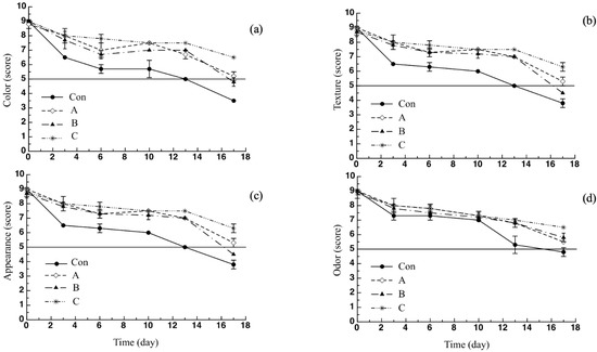 As reported beforehand, a panel of expert judges was used to assess the breaded cod stick sensory properties in terms of odor, color, texture and general appearance. The mean values of sample overall quality were reported in Figure 5. As can be seen, during the 17 days of observation the control sample reached the acceptability threshold (score = 5) after 11 days, whereas the overall quality of all active samples was above the acceptability limit up to the end of the observation period. It is worth noting that sample C overall quality was always higher than that of the other two active samples. In particular, at the end of the observation period, the overall quality of sample C was well above the acceptability threshold (6.3), whereas that of samples A and B were much closer to the abovementioned limit at 5.5 and 5, respectively. Details about the trends of each single sensory attribute are reported in Figure 6. Specifically, for the control sample, a marked decline of the color (Figure 6a) was observed after 3 days (6.5) compared with the active samples of A (8.0), B (7.7) and C (8.0), which recorded much higher scores. In fact, the control sample was considered to be much darker if compared to the active sticks. A similar trend was found in terms of sample texture (Figure 6b) and appearance (Figure 6c). In fact, the Con sample was considered less compact and more humid than the active samples. As far as odor is concerned (Figure 6d), all samples recorded a score higher than the acceptability threshold without substantial differences among them until the 13th day, after which, there was a faster decay of this specific sensory attribute in the case of the control sample compared to the active fish. At the end of the storage period, a value of 4.8 was observed for the control sample, whereas the samples A, B and C obtained scores of 5.5, 5.8 and 6.5, respectively.