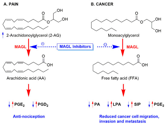 Role of MAGL inhibitors in the alleviation of pain and cancer. PG: prostaglandins; PA: phosphatidic acid; LPA: lysophosphatidic acid; and S1P: sphingosine-1-phosphate.
