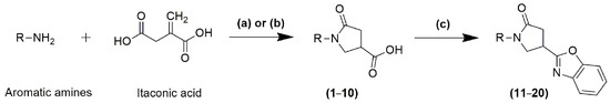 Intermediate compound 1, (1-Benzyl-5-oxopyrrolidine-3-carboxylic acid), was successfully prepared by fusion of benzylamine and methylidenesuccinic acid in water, while compounds 2–10 were synthesized as reported by us in our previous publication [45]. The fusion of synthesized 1-substituted-5-oxopyrrolidine-3-carboxylic acids (1–10) with 2-aminophenol was done by the procedure reported earlier with some minor modifications [46]. The fusion of acids (1–10) and 2-aminophenol was carried out by the use of polyphosphoric acid, giving better yields (57–70%) and purity of benzoxazole derivatives (11–20).