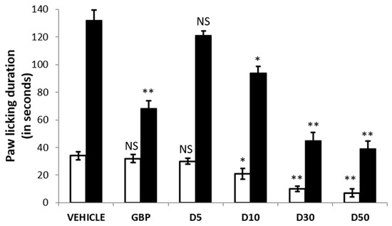Formalin-induced analgesic test; a dose of the test compound 20 (5, 10, 30, and 50 mg/kg, p.o, suspended in 0.5% CMC) was administered 4 h before formalin injection (50 µL, 2.5%). Reference drug, gabapentin (100 mg/kg, i.p, dissolved in 0.9% normal saline) was injected 30 min before formalin injection. Total paw licking and biting duration, Stage I (white bar, 0–5 min) and stage II (black bar, 10–30 min) was recorded as a measure of pain behavior. Data is represented as mean ± SEM from a group of 10 animals. * p < 0.05, ** p < 0.01, p > 0.05 (NS, nonsignificant) vs. control (vehicle). GBP: Gabapentin; D5, D10, D30, andD50 are the dose concentrations of test compound 20.