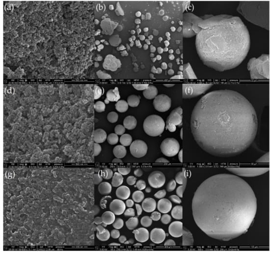 SEM images of DVB:TEVS = 1:2 (a–c), DVB:TEVS = 1:1 microspheres (d–f) and DVB:TEVS = 2:1 microspheres (g–i) in different magnification.