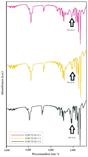 FTIR/ATR spectroscopy was applied to assess the advancement in the phase bonding of the organic-inorganic microspheres. The building of dual systems is associated with the content of both polymeric as well as silane phases. Therefore, the characteristic vibrations from divinylbenzene and triethoxyvinylsilane have been observed (Figure 2). The spectra show bands at 1000–1110 cm−1 associated with the asymmetrical stretching vibrations of Si–O–C groups, which confirm the incorporation of TEVS into the polymeric structure of the synthesized material. This peak is not observed for divinylbenzene (Figure S1, Supplementary Material). The TEVS introduction into the polymeric phase has been found for all studied materials. However, the peak with the highest intensity is observed for the sample with the highest amount of triethoxyvinylsilane [33]. The existence of stretching bonds C–H of methyl (-CH3), ethyl (-CH2–CH3) ~2900 cm−1 and vinyl groups (-CH=CH2) ~3080 cm−1 and ~2998 cm−1 and aromatic ring of divinylbenzene ~3020 cm−1 are observed. The peak intensity of aromatic ring for DVB:TEVS materials is associated with the sample composition. For DVB:TEVS = 1:2 this peak intensity is the lowest. The stretching vibrations of C=C from vinyl groups are found at 1650 cm−1. The ring stretches of aromatic ring are visible at 1600, 1500 and 1450 cm−1, respectively. The deformation vibrations of methyl and ethyl groups are observed in the range of 1470–1350 cm−1. Moreover, in the range of 900–650 cm−1 is possible to see deformation bands of C-H groups at benzene ring, therefore, the presence out of plane ring and H bending vibrations at 695 and 750 cm−1 is detected. Besides, the out of plane bending and twisted vibrations of vinyl groups at 908 and 991 cm−1 are observed [36,37,38,39,40,41,42].