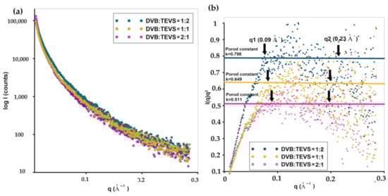 The scattering properties of organic-inorganic materials can be discussed by Porod law. In this case, the scattering effect at large q values is applied. According to Porod law, the scattering curves of particle systems and porous materials with smooth surfaces decay proportionally to q−3 at large angles (I(q) ≈ k3/q3 for smeared data). When Porod’s law is observed for experimental data (like in Figure 3b), it is a good indication of well-defined interfaces between regions of different electron density. Here, the scattered intensity is proportional to the reciprocal of suitable power of scattering vector (I(q)~k4 for non-smeared SAXS data and I(q)~k3 for smeared SAXS data). Figure 3b shows the calculated Porod plots for investigated samples. Porod curves display a plateau and the SAXS data asymptotically approaches a constant value. The procedure allows evaluating the Porod constant k based on the asymptotic decay of the scattering curve at the higher angles. The amplitude of the asymptote is proportional to the particle’s surface-area-to-volume ratio and concentration. The most important feature of the Porod law suggests that the Porod constant is proportional to the surface area and the square of the electron density contrast. In this case, a simple comparison of the Porod constant allows illustrating the differences in the specific surface of materials in a way that is much simpler and faster than conventional methods of testing porosity. Comparing the absolute S/V values calculated from the Porod approximation, a clear decrease in the value for the sample containing the majority of the organic phase is visible. The S/V values equal 0.061 Å−1, 0.048 Å−1 and 0.039 Å−1 for DVB:TEVS = 1:2, DVB:TEVS = 1:1, and DVB:TEVS = 2:1 samples, respectively. This suggests creating an extended three-dimensional surface of material containing mostly an inorganic blowing agent and a significant reduction of this surface by increasing the degree of smoothness using larger amounts of the organic phase. The estimated values of the interface surface from SAXS data (SSAXS) are given in Table 1 and are equal to 521, 402 and 311 m2/g, respectively. Comparison of the specific surface area determined by using two different methods (low-temperature nitrogen sorption method: Brunauer–Emmett–Teller (BET) and SAXS indicates a correlation between both techniques for evaluating structural characteristics generated by polymer-domains and pores. Slight differences indicate a low amount of closed porosity of the microspheres.