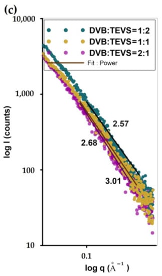 The highest level of scattering was observed for DVB:TEVS = 1:2 sample, whereas the lowest was noticed for DVB:TEVS = 2:1. Due to the presence of scattering objects (polymer domains) in the materials’ body, their size and relative quantity may be responsible for the scattering capacity and observed differences. Although all tested materials have a similar type of morphology, polymer domains in the DVB:TEVS = 1:2 sample should be marked as more visible. The phenomenon can be associated with the enhanced porosity of material as a result of greater amount of TEVS. In the case of this sample (DVB:TEVS = 1:2), increased porosity is associated with a higher amount of crosslinking agent and may cause the presence of additional nanometer forms (pores) able to generate the scattering effect [50,51]. In this way, a comparison of the level of scattering by hybrid samples can provide information about the degree of surface homogeneity [52,53].