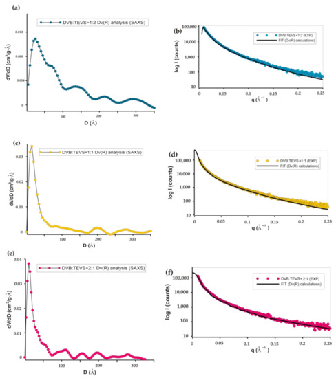 Particle Size Distribution by volume analysis Dv(R) for investigation systems: DVB:TEVS = 1:2 (a), DVB:TEVS = 1:1 (c) and DVB:TEVS = 2:1 (e). The insets of plots correspond to fit curves extrapolated for experimental SAXS data (b,d,f).