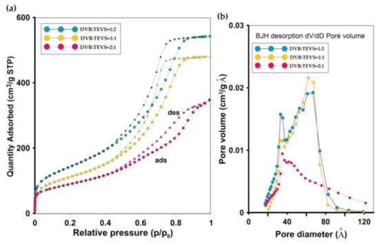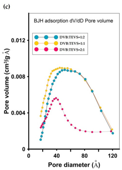 The nitrogen adsorption-desorption isotherms for DVB-TEVS materials (a), pore size distributions by the Barrett–Joyner–Halenda (BJH) with Halsey-Faas correction for desorption (b) and adsorption data (c).