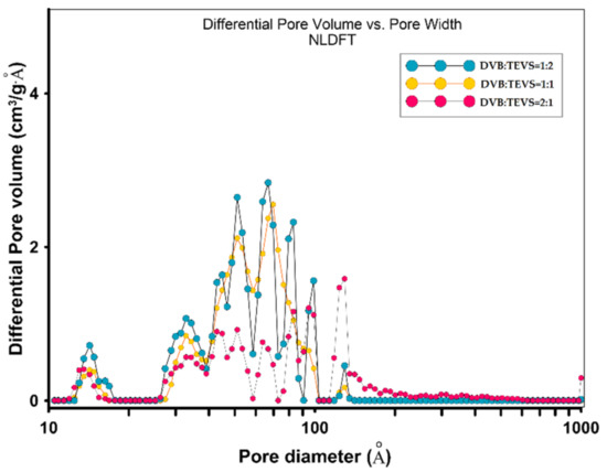 The porosity characteristics of polymeric-inorganic microspheres were determined on the basis of low-temperature nitrogen adsorption-desorption measurements. In Figure 5 and Figure 6 the isotherms and pore size distributions are presented for all studied DVB-TEVS materials. The structure parameters are presented in Table 2. The differences in the isotherm course and nitrogen uptake reflect an essential variation of the porous structure. The shape of adsorption isotherms indicates a small content of micropores and significant content of mesopores. The difference between the adsorption and desorption is observed for all samples as elongated hysteresis loop of H1 type. The decrease of nitrogen adsorption, specific surface area and pore total volume is well correlated with DVB:TEVS ratio, more TEVS content the higher structure parameters. The highest specific surface areas (SBET) are for DVB:TEVS = 1:2, the medium for DVB:TEVS = 1:1 and the lowest for DVB:TEVS = 2:1 with values: 521, 402, 316 m2/g, respectively. It is evident that the addition of crosslinking agent TEVS develops porous structure of organic-inorganic materials. The increase of pore size as the average value with increase of DVB content is observed, however, the differences are not significant. The pore size distribution functions for all studied materials show similar tendencies as those obtained from SAXS data. Generally, the determined values are in good agreement with data from SEM microscopy and SAXS analysis.