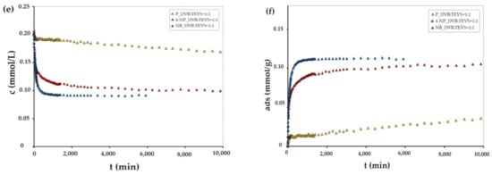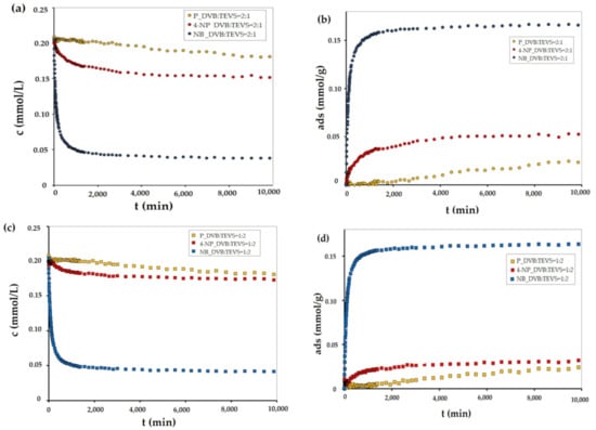In order to investigate the adsorption effectiveness of the synthesized microspheres the kinetic profiles for nitrobenzene (NB), 4-nitrophenol (4-NP) and phenol (P) adsorption from aqueous solutions were measured. In Figure 7, Figure 8 and Figure S2 (Supplementary Material) the concentration and adsorption profiles on DVB:TEVS = 2:1, DVB:TEVS = 1:2 and DVB:TEVS = 1:1 materials are compared.