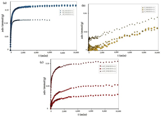 Adsorption kinetics for NB (a), P (b) and 4-NP (c) on DVB:TEVS = 2:1, DVB:TEVS = 1:2 and DVB:TEVS = 1:1 materials presented as changes in adsorption over time.