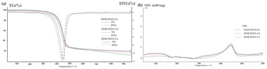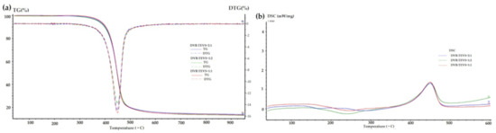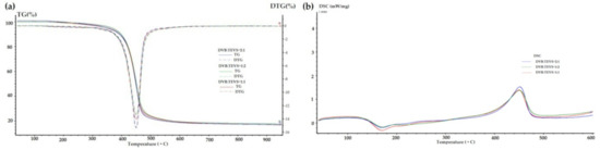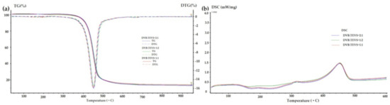 TG, DTG (a) and DSC (b) curves for DVB-TEVS materials measured in helium conditions.