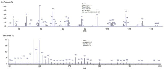 MS spectra of DVB:TEVS = 1:1 decomposition at 450 °C.