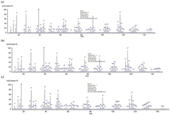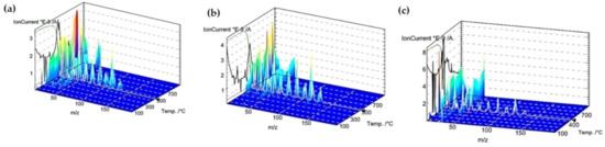3D MS profiles registered during decomposition of DVB:TEVS = 1:1 after adsorption of P (a), 4-NP (b) and NB (c).