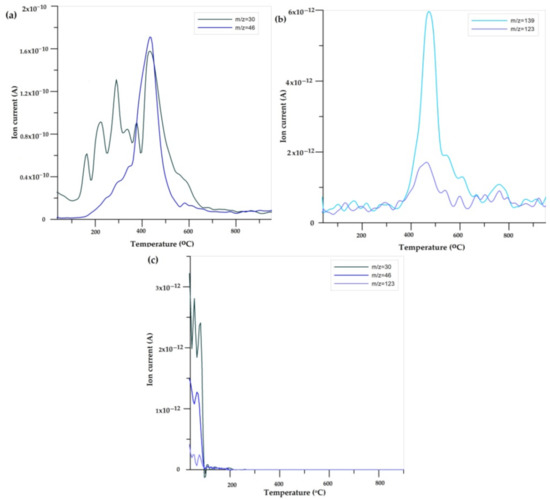 MS gaseous profiles registered during decomposition of DVB:TEVS = 1:1 after adsorption of 4-NP m/z = 30 and 46 (a) and m/z = 139 and 123 (b) and of NB m/z = 30, 46 and 123 (c).
