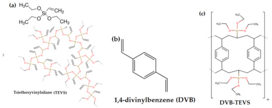 In this work, divinylbenzene-co-triethoxyvinysilane (DVB-TEVS) microspheres were synthesized by a copolymerization reaction at three different molar ratios 1:2, 1:1 and 2:1, in which the DVB is the organic phase and TEVS, an inorganic one. The divinylbenzene molecule has an aromatic ring linked with two vinyl groups structure (Figure 18b) while the TEVS used as a crosslinking agent is an inorganic compound with formula (Si(OCH3)3CH2) (Figure 18a). Organic-inorganic materials similar to DVB-TEVS are described in the literature, however, there is still an ongoing search for new materials showing high efficiency and selectivity towards various groups of pollutants. The proposed organic-inorganic microspheres show promising properties, especially as adsorbents for the removal of heavy ions and organic compounds from aqueous solutions and selective materials for solid-phase extraction techniques, because of their well-developed porous structures. Also, these materials are characterized by good thermal resistance [35,36,37,38,39,40,41,42].