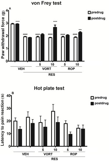 Pain threshold of RES-treated mice was assessed at two time points, i.e., before the test drug (VORT, ROP, or VEH) administration (referred to as ‘predrug’ measurement) and 60 min after its administration (‘postdrug’ measurement). Both mechanical and thermal nociceptive thresholds were assessed in each experimental group using the von Frey test and the hot plate test, respectively.