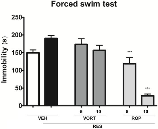 In the FST Dunnett’s post hoc test revealed that although RES prolonged immobility in mice this effect was not specific, i.e., the effect of RES on the duration of immobility compared to that of VEH was not statistically significant (Figure 3). In contrast to this, in mice treated with RES, both doses of ROP significantly reduced the duration of immobility (p < 0.001 vs. RES + VEH group; Figure 3). In this test, VORT did not influence immobility of animals, which were previously treated with RES (Figure 3).