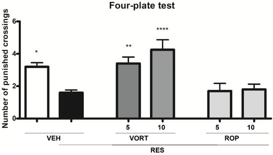 Dunnett’s post hoc analysis revealed that the number of punished crossings in the RES + VEH group was significantly lower as compared to the VEH group (p < 0.05), RES + VORT 5 mg/kg (p < 0.01), and RES + VORT 10 mg/kg groups (p < 0.0001, Figure 4). ROP at doses 5 and 10 mg/kg did not show anxiolytic-like properties in the mouse FPT (Figure 4).