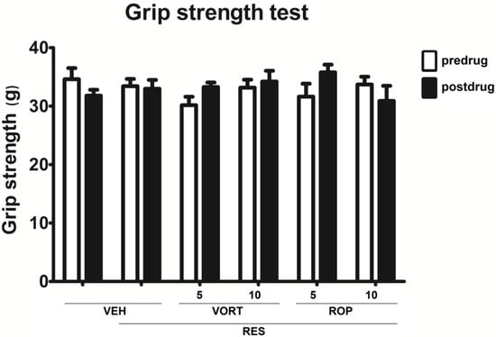 The grip strength test was carried out to assess if RES, VORT, or ROP affect muscle strength of mice. Repeated measures ANOVA showed that neither drug effect, time effect, nor the drug × time interaction were significant (F[5, 108] = 0.4860, p > 0.05, F[1, 108] = 0.1589, p > 0.05, and F[5, 108] = 1.639, p > 0.05. respectively) and none of the drugs used affected muscle strength of mice (Figure 5).