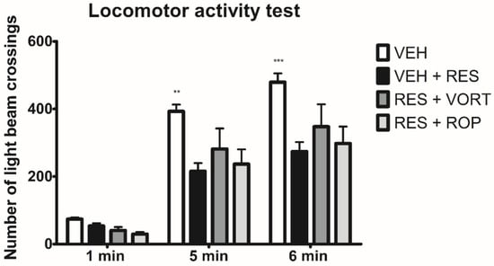 Locomotor activity did not differ in RES + VEH group compared to RES + VORT group or RES + ROP group. However, locomotor activity of RES + VEH group was significantly decreased as compared to the VEH group (p < 0.01 in the 5th min of the test, and p < 0.001 in the 6th min of the test, Figure 6).
