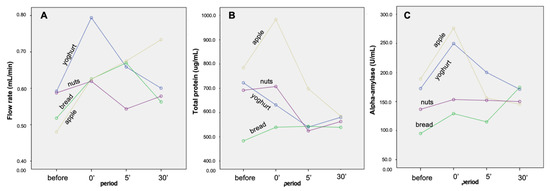 Variations of flow rate (A), total protein concentration (B) and salivary alpha-amylase enzymatic activity (C) induced by intake of different snacks.