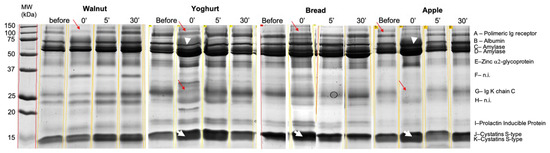 The staining protocol used for the gels allowed the observation of bands with violet/pink coloration, which are expected to be proline-rich proteins (PRPs) [25], in the regions of 75–100, 35 and 23 kDa (Figure 5). These last two bands correspond to bands F and H, which were not identified by mass spectrometry. Since trypsin fails in cleave the polypeptide chain when lysine or arginine are close to a proline, PRPs usually fail MS identification, reinforcing the hypothesis of these two bands corresponding to PRPs. In the case of band F, it increased after yoghurt intake, being at control levels 5 min after, whereas band H increased only after walnuts ingestion, remaining higher for at least 5 min. The evolution of these two bands, through time, can be seen in Figure 3.