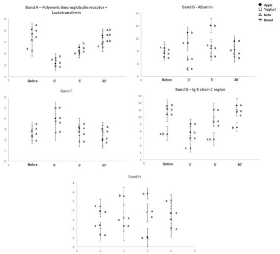 The expression levels of some of these proteins were observed to change after snacks intake, with the type of snack influencing the changes (Table 1). The bands containing chains of immunoglobulins (band A and band G) decreased in the expression levels immediately after the ingestion of the snacks. Exceptions were the cases of walnuts, where the change in band A was not significant, and bread, where the change in band G was not significant (Figure 3).