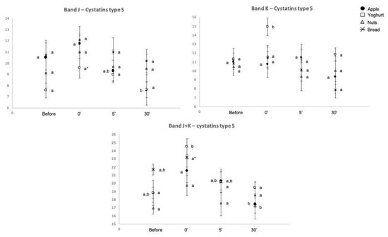 The bands containing cystatins (bands J and K) increased immediately after intake of all snacks, except walnuts (Figure 4).