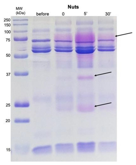SDS-PAGE gel stained flowing Beeley’s protocol [25] for differential coloration of PRPs (arrows). Samples obtained from walnuts snack are presented as example.