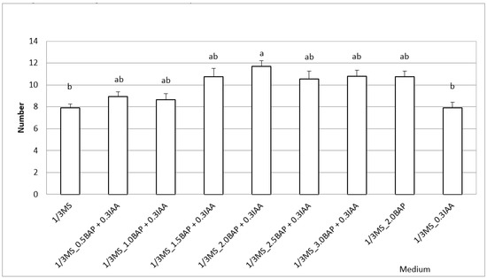 The effect of BAP (Sigma Aldrich, Saint Louis, MO, USA, cat. No. B3408) concentrations (0.5, 1.0, 1.5, 2.0, 2.5, 3.0 0.0 mg/dm3) combined with IAA (Sigma Aldrich, Saint Louis, MO, USA, cat. No. I5148) (0.3 mg/dm3) was tested at the first step of experiments (I passage) and second (II passage). The MS was used as the basal medium [45] with the content of macro- and micronutrients reduced to ⅓. The experiment was established in five replications, each containing six single plants (2.5 to 3.0 cm length). In the first step of the experiment, the explants acquired were measured, next cut into 2.5–3.0 cm-long sections and placed on the ⅓MS without PGRs (II passage), in the same experimental scheme as the above mentioned. They were cultivated for the subsequent 14 weeks. Such values as the length of plants [cm], number of leaves, number of new shoots, root length [cm], number of roots, plant fresh and dry weight [g] were assessed after 12 (I passage) and next 14 weeks (II passage). The cultures during I and II passage were carried out at 20 °C, light intensity of 2500 l× and photoperiod 16/8 (day/night). A two-way analysis of variance (ANOVA) was performed to evaluate the influence of PGRs on micropropagation efficiency. Additionally, one-way analysis of variance was conducted for summarized development of new shoots after two cycles of passages. Values of standard errors (SE) were calculated.