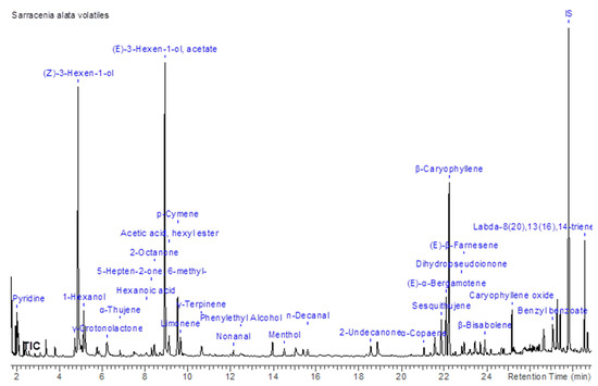 The volatile compounds present in S. alata were analyzed using the solid-phase microextraction (HS-SPME) approach on a GC-MS Varian CP-3800/Saturn 2000 apparatus. Several linear short-chain alcohols as well as aldehydes were found, e.g., 1-hexanol (2.73% ± 0.12), (Z)-3-hexen-1-ol (16.48% ± 0.31), (Z)-3-hexen-1-ol acetate (19.99% ± 0.01) (Figure 2; the more detailed chromatograms are given as Supplementary Materials as Figures S5–S7 Chromatograms). The predominated sesquiterpenoid compounds were β-caryophyllene (11.30% ± 0.27) and α-bergamotene (4.15% ± 0.19). Additionally, the diterpenoid labda-8(20).12.14-triene (4.89% ± 0.09) as well as its isomers were identified (a detailed list of identified volatiles given in the Supplementary Materials as Table S2—Volatile profile of Sarracenia alata microcuttings). Nevertheless, the most surprising was the presence of pyridine in the plant aroma profile. In order to confirm that this finding is not an artifact, or an effect of contamination, a series of blank analyses was conducted (blank sample preparation and extraction process was performed like for a regular sample without plant material). Some of the compounds found in S. alata could play the main role as attractants of insects.