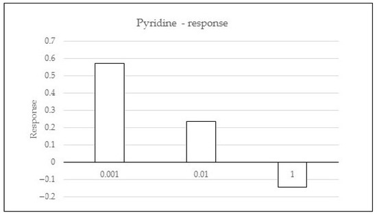 Pyridine significantly influenced the flies’ behaviour. For the first two concentrations (0.001 and 0.01), the response was positive (0.57 and 0.23, respectively), while for the last (1%), negative response was observed (−0.14) (Figure 3). In other words, the number of attracted flies decreased with the increasing dose of the extract.
